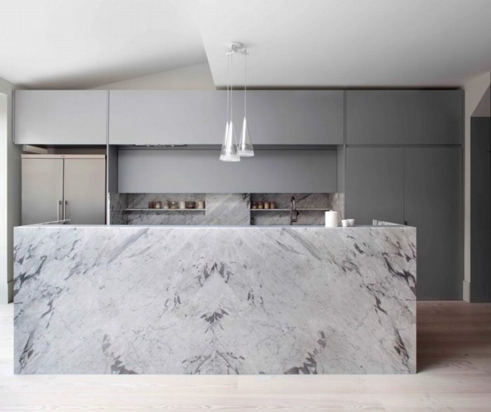 Màu xám là màu sắc được lựa chọn nhiều nhất cho nhà bếp trong năm nay. Đá marble (cẩm thạch) cho thấy chiều sâu của nó. Kết hợp cùng gỗ