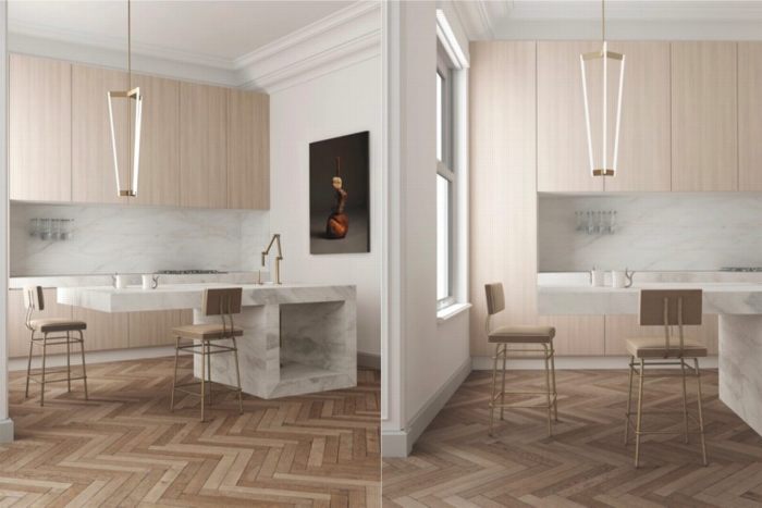 Một không gian Bắc Âu hoạt động tốt với đá cẩm thạch. Những bức tường trắng và sàn gỗ phù hợp với các tiết tấu đá cẩm thạch, ghế đẩu cao mang đến sự sang trọng và tươi sáng.